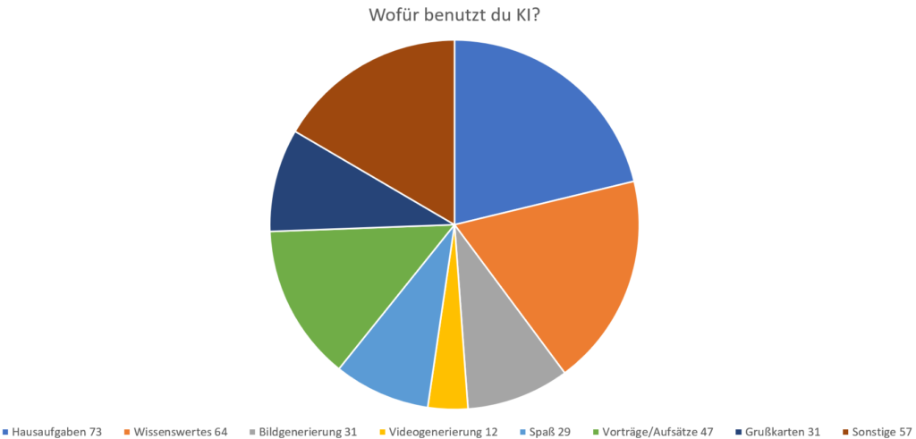 In dieser Umfrage beschäftigten wir uns mit dem Gebrauch von KI im Alltag. Hierbei wurden sowohl Schüler und Schülerinnen unserer Schule, als auch Besucher des „Tages der offen Tür“ befragt. Insgesamt nahmen 141 Personen an der Umfrage teil. Hierbei konnte jeder mehrere Stimmen abgeben. Seht hier das Ergebnis.